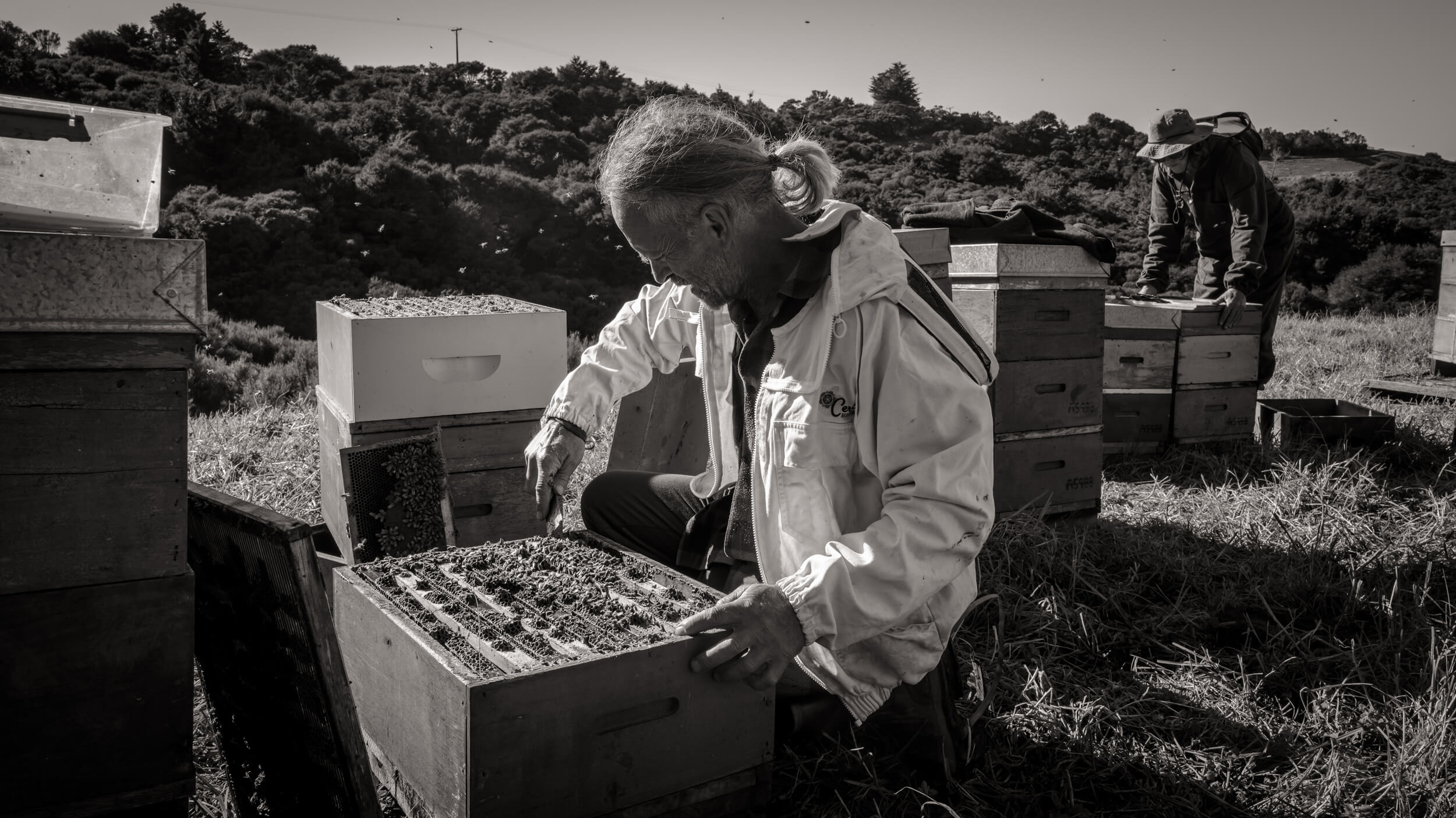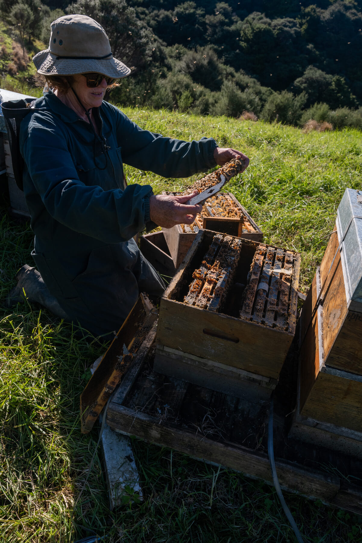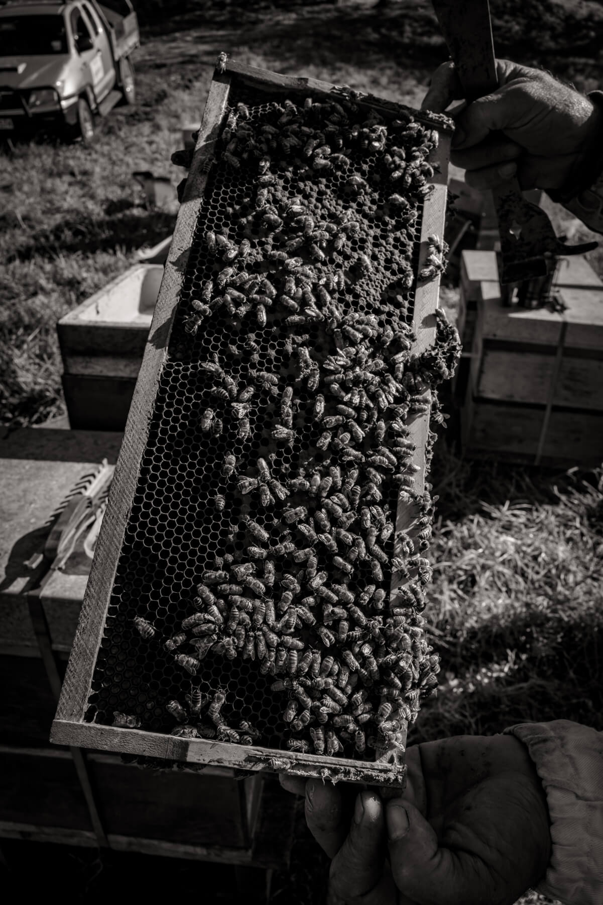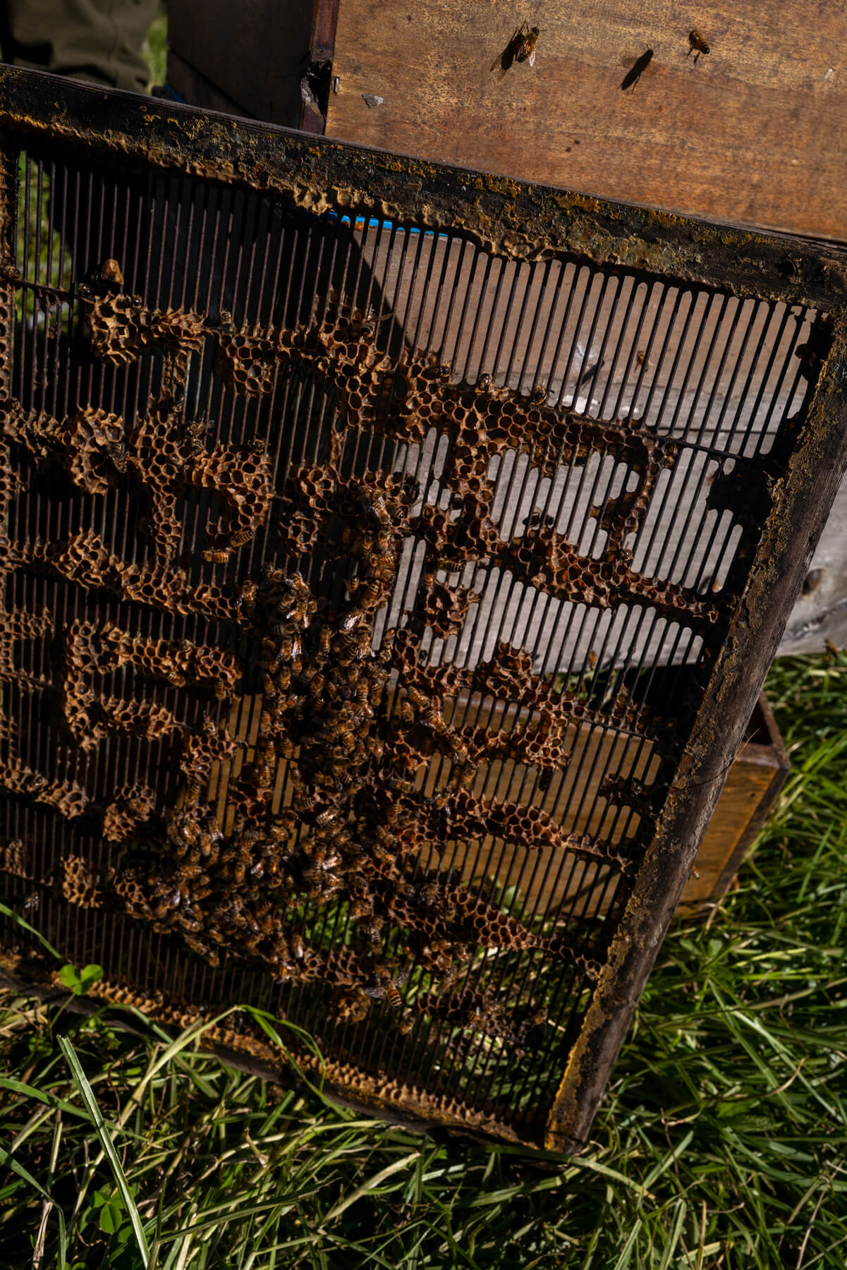 They manage many parts of the process themselves: queen breeding, harvesting, extraction, and bottling. They do not heat the honey; they extract and bottle it soon after the honey frames are capped. The honey is strained just twice.